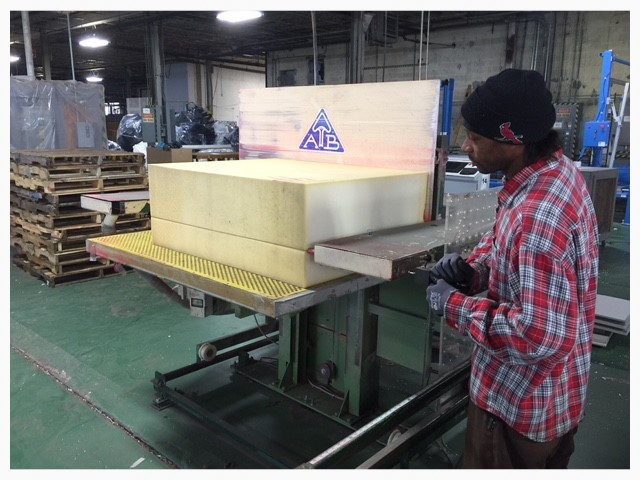 A slitter cuts PU blocks into sheets. PU buns do not always run the same height and sometimes we can get more or less sheets out of blocks due to this irregularity. The quantity of your order may have to change to compensate for this variance. Our slitter can also cut a block into multiple thicknesses and quantities. This helps us utilize the full height of the block. It also allows you to mix your thicknesses to
