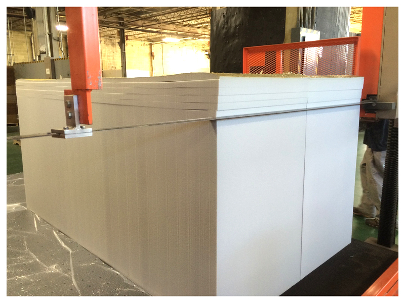 The flashcutter is another truly amazing machine. We simply draw a foam part, load its shape into the machine's computer, and the machine cuts everything from that point on. The machine can also determine the best layout to minimize scrap.You can even send us a DXF formatted file with your requested shape and our machine can cut it.This machine is used mostly for prototyping, low volume orders and shapes that require a straight cut edge.It can also cut very large shapes.This saw can cut up to four inches thick, 60" wide and 120" long. Most importantly the Flash cutter makes it simple and fun for us to explore mutiple design possibilities to solve the most challenging packaging problems.